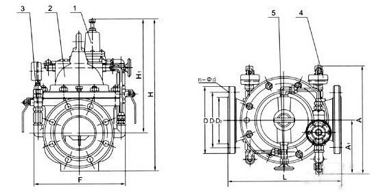 當閥門從進口端給水時,水流過針閥進入主閥控制室,出口壓力通過導管作用到導閥上。當出口壓力高于導閥彈簧設定值時,導閥關閉。控制室停止排水,此時主閥控制室內壓力升高并關閉主閥,出口壓力不再升高。